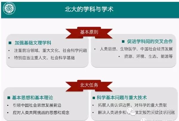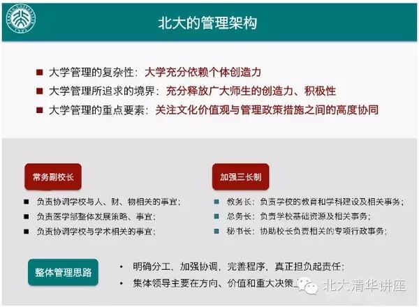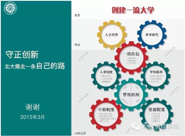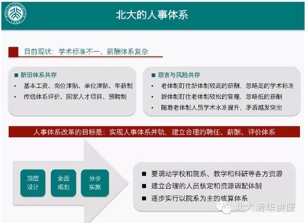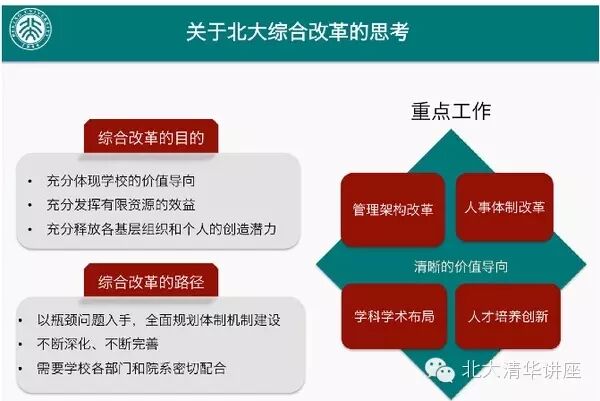 管理架构 当组织构架存在不合理的地方时候,就会造成责权利界定含混,致使运营效率低下和资源浪费严重,组织战略需要建立在有效组织架构基础上。校领导班子的责任就是要带领团队,深入分析大学内部深层次的体制机制问题,要根据学校的发展特点、国家社会的需求、学科发展趋势,制定好学校的整体发展战略,寻找到制定切实可行的发展路径。 学校对高层行政系统分工做了适当调整,核心也是明确分工,加强部门和院系间的协调,提高管理效率,减少行政化倾向,充分发挥教师主体作用,办好让学生和社会满意的北大。 人事体系 北大的学术队伍建设成效显著,人事体系建设稳步推进,薪酬也处于全国较好水平。但人事体系双轨制风险仍然存在,必须加快人事体系改革步伐。人事体系建设的基本目标是实现人事体系并轨,建立合理的聘任、薪酬、评价体系。这是一项复杂的系统工程,既要顶层设计,全面规划,分步实施,更要调动各方资源,逐步建立科学有效的人员和资源核定等调配体系。 学科学术 学科布局是大学基础。我们的学科比较齐全,这有利于学生培养和成长。但资源的限制要求我们必须有所为,有所不为。 我们现在就应当考虑:几十年后,人们还能记住我们今天哪些领域的学术成就?中国的经济发展举世瞩目,而中国社会发展、国家治理需要新思想和新理论都支撑,北大应当有所建树。我们鼓励教师在国家发展的基本思想、人类面临的重大挑战,以及资源、环境、生态和能源等领域的学术研究。 人才培养 尽管大学职能经历了多次重大变革,从单纯地传承知识,到学术研究和服务社会,培养人始终是大学的核心使命。事实上,毕业生的成就在成百倍地放大学校的学术和社会影响力。正是大学的教育职能,要求我们具有更高的道德和价值追求,要求我们坚持真理,鼓励多元文化和学术争鸣。 近年来,我们主要是借鉴国外大学的经验,推进教育教学改革。今天,我们应当走自己的路,根据北大实际,建立我们自己的教育体系。我们必须改变“以知识和学科为中心”的观念,改变“以讲授为中心”的方式,真正使教师成为学生和人类伟大智慧之间的心灵媒介,真正启迪学生智慧,激发出学生的内在潜力。 北大综合改革的思考 综合改革是要在有限资源条件下,充分调动起基层组织和个人的积极性和创造性,凝心聚力,共同为学校使命和任务而奋斗。大学管理的各个环节相互影响、相互制约,因而综合改革是复杂的;但综合改革也是简单的,只要我们紧紧抓住阻碍发展的瓶颈问题,找出产生问题的体制机制原因,集中力量加以解决,就能释放蕴藏在师生中的创造潜力,实现学校的可持续发展。当然,随着改革深入,会有新的问题出现,因此,综合改革也是一个不断深入、不断完善的过程。 2015年是学校综合改革的关键之年,学校决定从管理构架调整、人事体系建设和人才培养创新三个方面,推进北大的综合改革。 管理构架改革:建立合理和高效的行政管理和学术管理构架,营造良好的文化和制度氛围;加强岗位责任制,实现权责利统一,加强学部建设,推进管理重心下移,逐步实现院系核算制。 人事体系改革:实现人事体系并轨,建立合理的聘任、薪酬体系、评价体系。 人才培养改革:建立完善多样化培养模式,调动教师积极性,真正落实教学是教师首要职责。 创一流大学,守正创新、走一条自己的路 能否在第四个十年,开启一条中国自己的高等教育发展之路,不仅关系到中国高等教育能否走到世界前列,更关系到中国人和中国梦,是每个教育工作者都需要认真思考;别再犹豫、别再模仿,北大需要飞越历史的苦难与辉煌,守正创新,坚定勇敢的走出一条自己的路,一条引领中国高等教育振兴之路。这应该是我们在座各位最大的梦想、最高的荣誉。