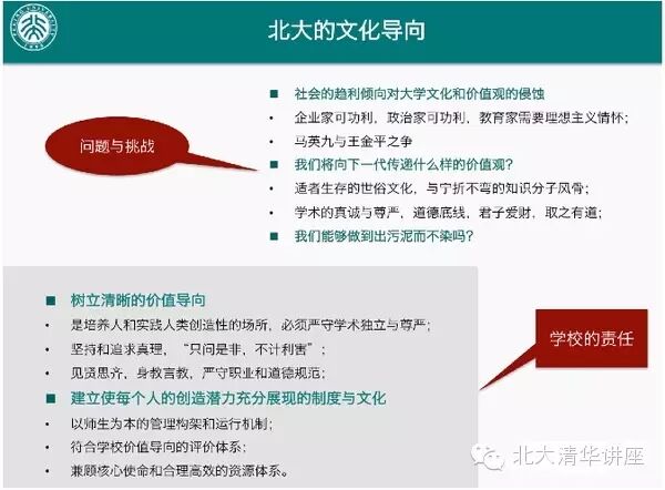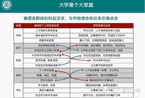 北大林建华:处于精神与信任危机的大学走向何方 以下内容整理自北京大学林建华校长2015年3月25日在北大中层干部会议上的讲话,这是今年北大的工作沟通会议,也是综合改革动员会。 再回燕园,离开北大四年多,任职了两所学校,使我能够以外部视角看北大。实际上,了解一个学校并不难,不用看数据,只要走入师生,看看他们在想什么做什么,就可以知道学校的状况。北大是中国大学中思想最为活跃的学校,也是最有望成为世界一流大学的学校。优秀大学的一个最显著特征是反思,因为他们要着眼未来,只有发现问题,树立危机意识,才能不断进步和发展。所以,我今天讲问题可能会多一些。 改革开放三十多年的中国高等教育 改革开放后的中国高等教育大致可以分成三个阶段。八十年代思想解放和科学春天、九十年代市场经济转型的阵痛和迷茫、本世纪创建世界一流大学的巨大进步和冲动。大学现在的基础和困难都有历史的痕迹。历史留给我们雄厚的物质和学术基础,也让我们丢掉了很多优良的学术传统,急功近利,好大喜功,媚俗畏权,大学正处于前所未有的精神与信任危机,这可能需要很多年艰苦努力才能真正消除。 北大十五年来走过的发展之路 十五年来,北大的发展势头很好,学术队伍水准大幅提升,理工学科的布局基本完成,前沿和交叉学科崭露头角,基础条件显著改善,教育质量稳步提升。但一些问题也逐步显现,新老人事体系之间矛盾初显,某些基础学科优势正在丧失,教学改革徘徊不前,功利风气抬头,独立和开拓精神不振。当然,这些问题并非北大独有,但若不及时化解,将会严重制约北大的长远发展。 国家和民族需要北大做什么 在知识经济、全球化和信息高度发达的今天,国家和民族最需要北大做什么?我以为,首要是培养能够引领国家和民族发展的人,这是我们的根本使命;二是要引领中国高等教育方向,重塑大学的公信与尊严;三是作为思想最为活跃的大学,我们应当在新思想新理论,以及在推进中国政治、社会和经济思想进步上有所作为,在拓展人类知识、解决人类面临重大问题上有贡献。 大学的逻辑 大学的学术影响力和社会影响力,来自对人类发展进程的贡献。大学学术研究产生出的新知识、新思想,对人类的文明进步意义重大,但大学更重要的贡献,是持续培养能够传承和弘扬人类文明的人,这是大学声誉的最主要来源。因此,大学一定要把主要精力放在人才培养上。大学逻辑的核心是培养人;培养高素质的人,需要高水准的教师队伍;为营造好的学术氛围,必须建立合理的聘任、评价和薪酬体系,必须建立合理的管理构架和资源调配体系。这既是大学的基础,也是大学发展的基本观念。 大学是个大家庭 大学中各个群体的利益诉求不尽相同,如何使每个人的创造潜力都充分发挥出来?是大学必须面对的问题。学校必须兼顾各个群体的利益诉求,也必须坚持学校的核心使命和价值导向。院系都会认为自己的学科领域最重要,也希望得到更多资源,学校则要通盘考虑。教师往往会更关注个人学术发展,学校还会要求教师关注学生、关注教学。事实上,任何基层组织和个人的发展,依赖于学校的整体发展和进步,反之,只有当基层组织和个人的潜力都充分发挥出来,学校才能真正办好。因此,大学应当建立包容各方利益的制度、政策和管理体系,应当把工作重点放在调动各个群体的积极性和创造性上。 文化导向 坚守道德和价值底线,防范社会不良倾向的侵蚀,是大学面临的严峻挑战。当我们以学校利益的名义,对逐利行为听之任之的时候,当为获得项目托人不觉得难堪的时候,在不知不觉之中,我们放弃了对道德和价值底线的坚守。而一些人会走的更远,会为个人的利益,损害学校声誉,甚至触犯国家法律。现实中的确有一些人用这样的方式成功了,也有一些人或许因宁折不弯而默默无闻。